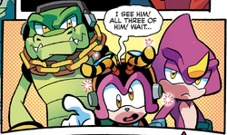 At some point during the ensuing war between the Eggman Army and the Resistance, Team Chaotix appeared in the City to help organize its defenses. A few days later, the City came under attack by an Eggman Army battalion. As Team Chaotix began preparing the troops, their efforts got slowed slightly down by an eager, but incompetent resistance rookie. When the Badnik battalion then broke into the City, Team Chaotix faced the robots head on. Thanks to the rookie though, the robots withdrew. Praising the rookie for their work, Team Chaotix began organizing an evacuation.[3]