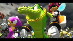 After six months of warfare, Eggman had taken control of more than 99% of the planet, leaving Team Chaotix and the rest of the Resistance with impossible odds to beat. Eventually, Team Chaotix met up at the Resistance HQ where they, after some discussions, were debriefed on the Resistance's newest recruit, the Avatar, whom Knuckles introduced them to. Learning soon after that Sonic was alive, but kept imprisoned onboard the newly-rebuilt Death Egg, Espio and Vector went to the Spaceport with a squad and managed to steal a shuttle for the Resistance to head to the Death Egg in. Discovering afterward that Sonic was to be banished into space soon, Vector and Espio joined the rescue team heading to the Death Egg. However, they quickly got lost. Luckily, the Avatar found Sonic and the group escaped with him. When the Avatar was then sent on a mission with Sonic, Vector and Charmy had opposing opinions about whether or not their latest recruit was up for it.