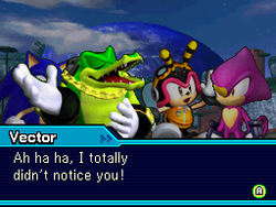 In the Nintendo DS version of Sonic Colors, Team Chaotix were tasked with investigating Dr. Eggman's Incredible Interstellar Amusement Park and finding Dr. Eggman. Arriving there, the group split up to scout Planet Wisp for clues. However, Charmy got distracted by the attractions while Espio utilized the local hazards to train. As both of them ran into Sonic and Tails, Vector awaited their reports before meeting Sonic as well. Fearing Sonic's involvement would cost Team Chaotix their reward, Vector initially told Sonic to leave, but allowed his help once Charmy provided a clue. When their search yielded no result though, Espio reunited with his team too. Seemingly giving up on their objective, Vector looked for other jobs for Team Chaotix, even offering Sonic to join their agency.
